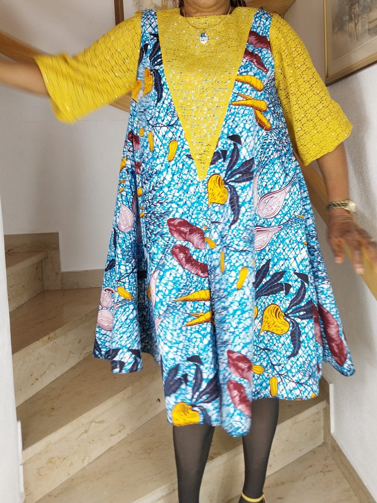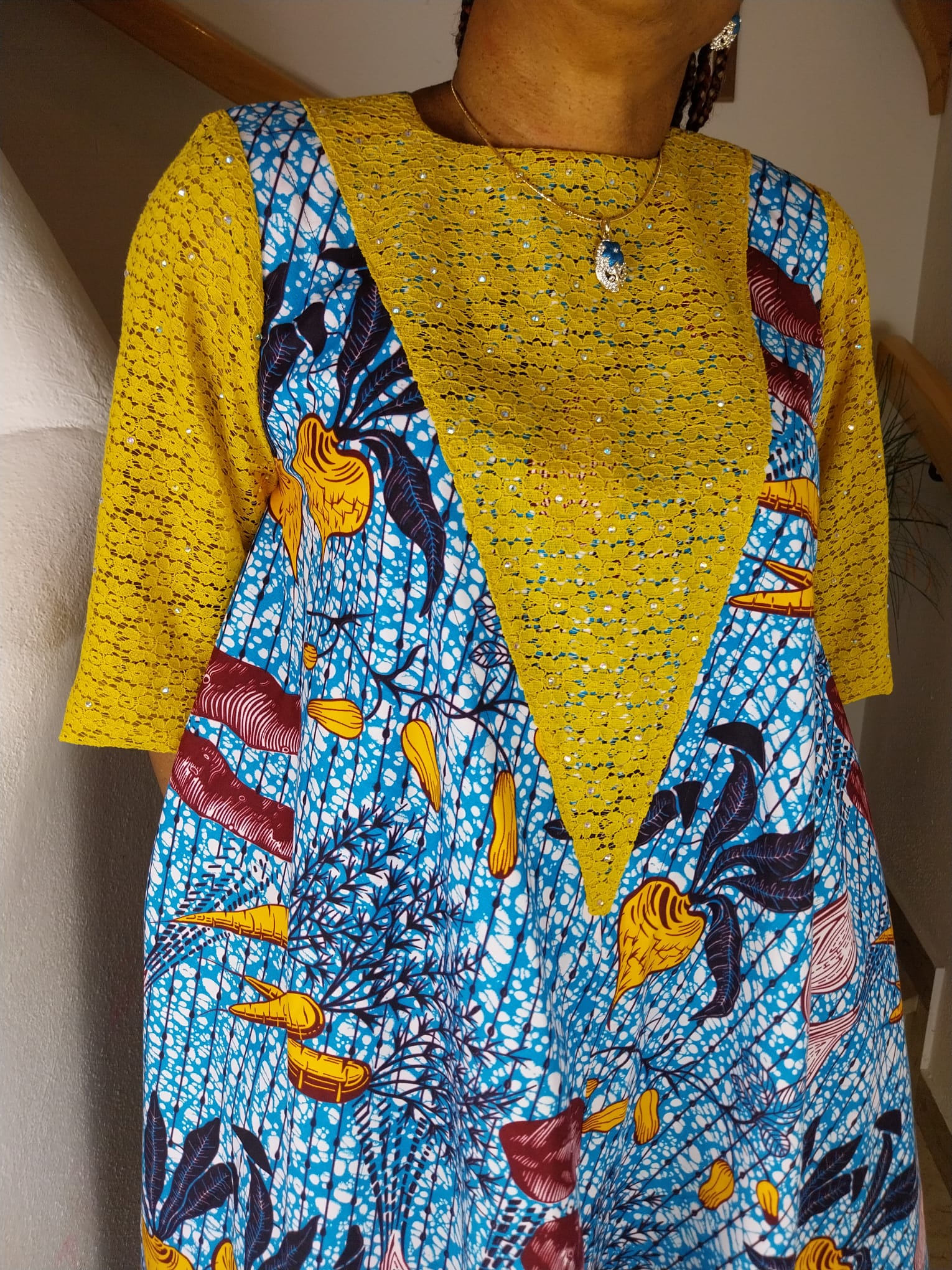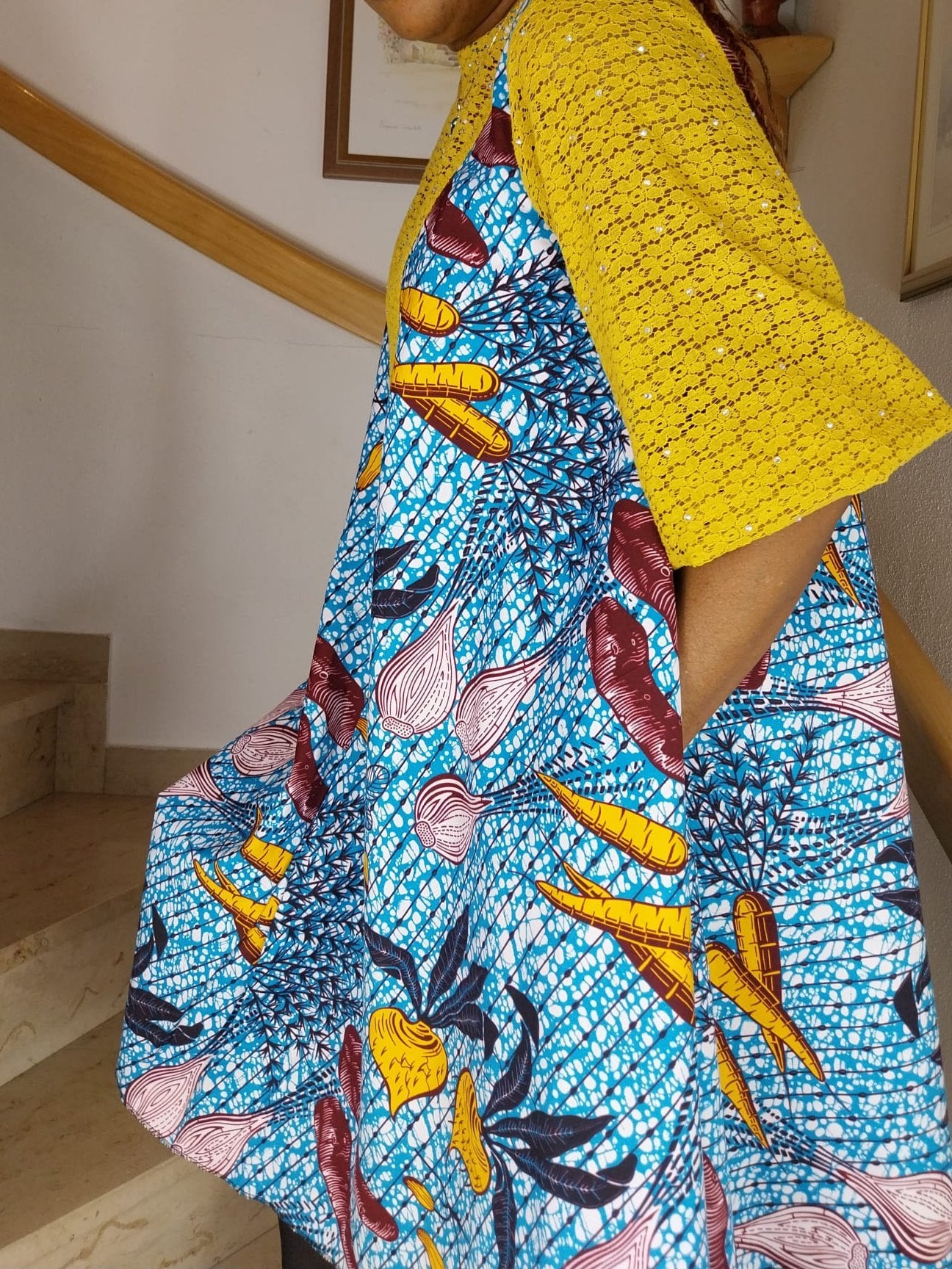 Midi flare ankara dress with mustard yellow lace design in front and sleeve, embellished with swarvoski stones. Made from 100% Cotton, it's a flared midi dress with two side pockets ..