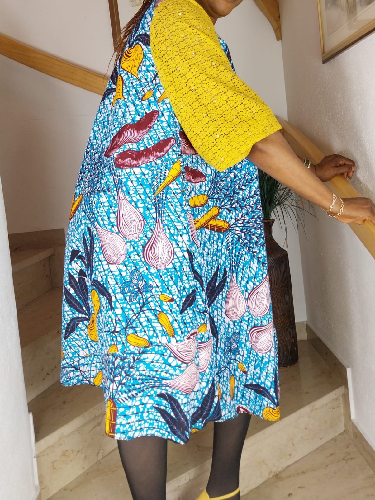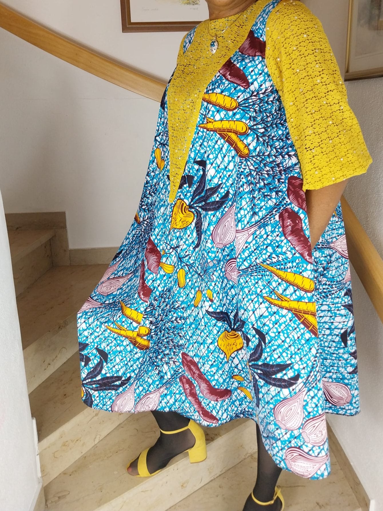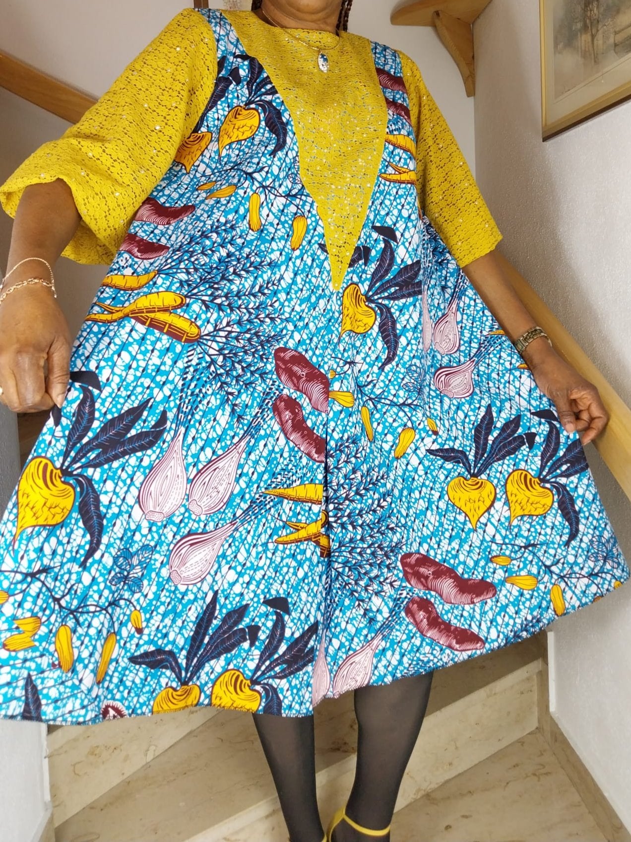 Midi flare ankara dress with mustard yellow lace design in front and sleeve, embellished with swarvoski stones. Made from 100% Cotton, it's a flared midi dress with two side pockets ..