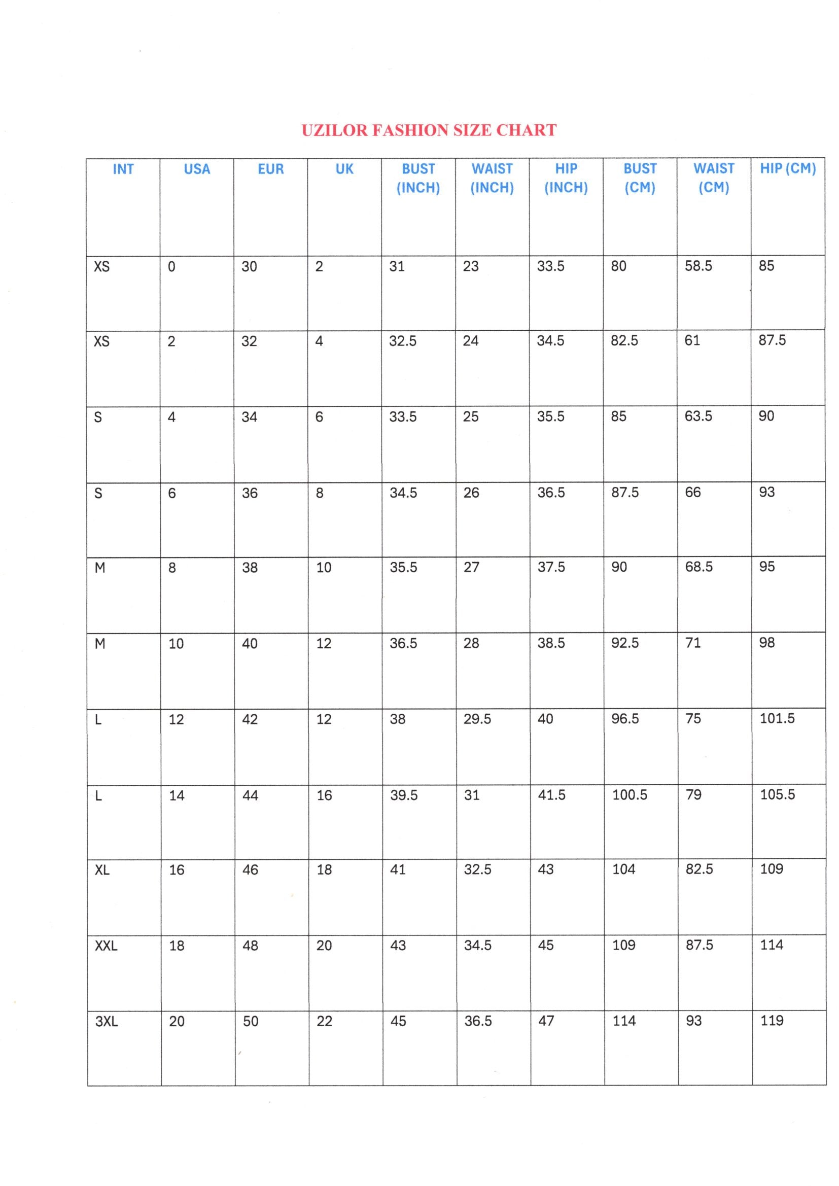NOTE: Please check the size chart for Bust, Waist, and Hip measurements.