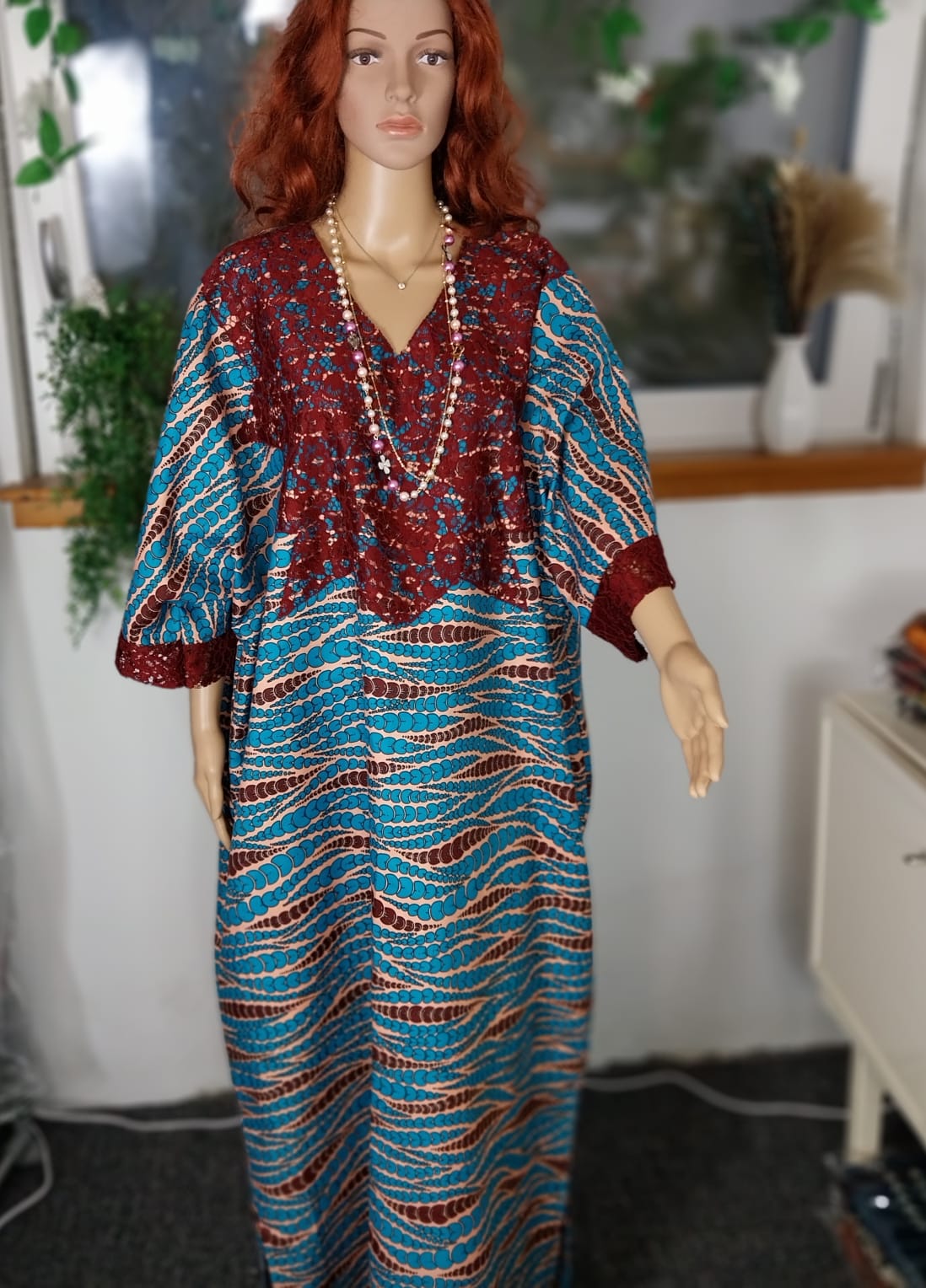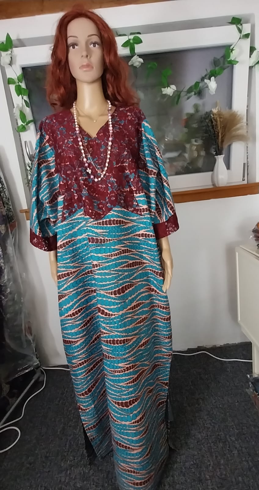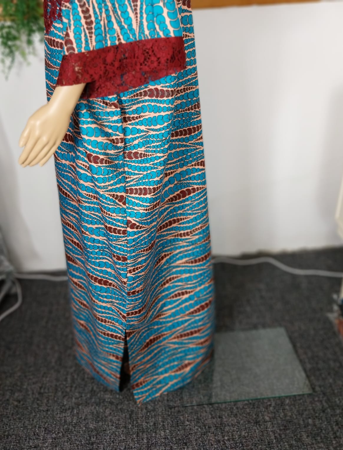 Ankara print fabric with a matching Wine coloured Lace front , made of 100% Cotton, it.s a straight Bubu dress with a head - Tie and two side pockets..it s perfect for all occasions such as weddings, Anniversaries, religious services,etc. Fabric does not Fade.
