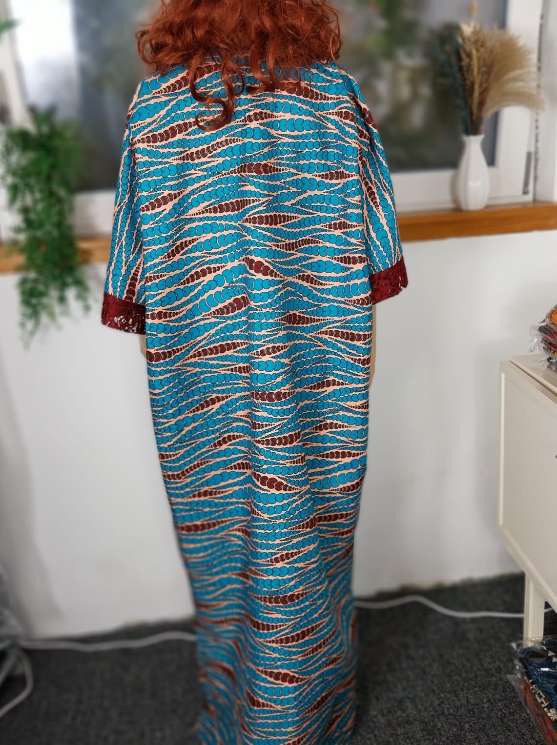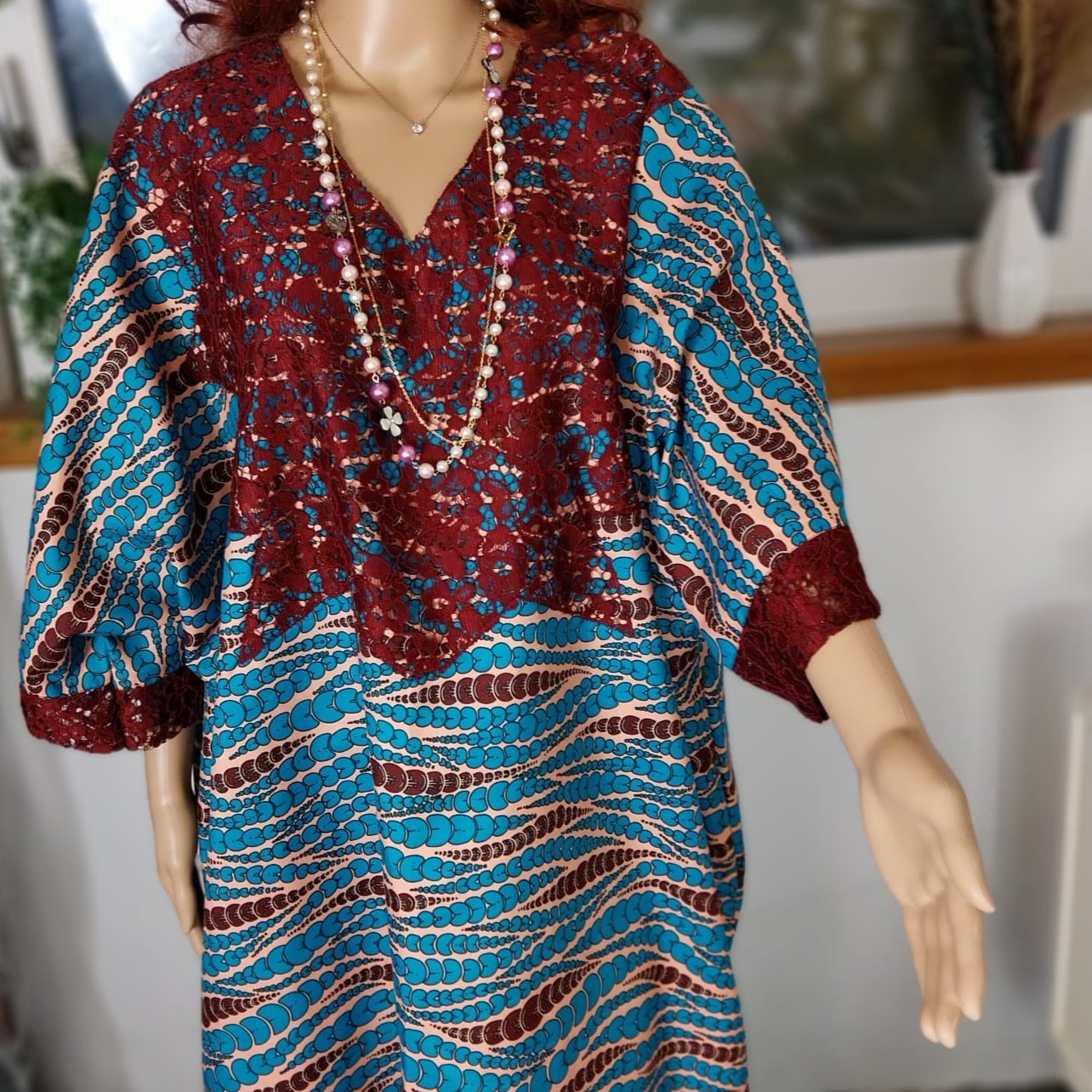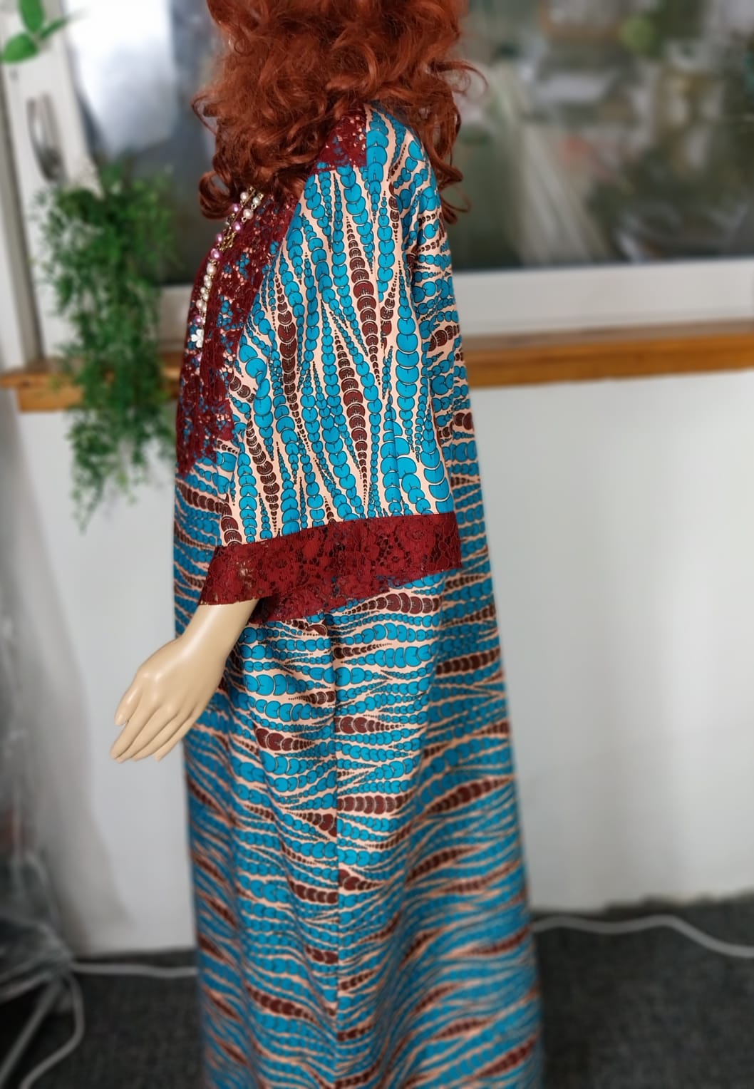 Ankara print fabric with a matching Wine coloured Lace front , made of 100% Cotton, it.s a straight Bubu dress with a head - Tie and two side pockets..it s perfect for all occasions such as weddings, Anniversaries, religious services,etc. Fabric does not Fade.