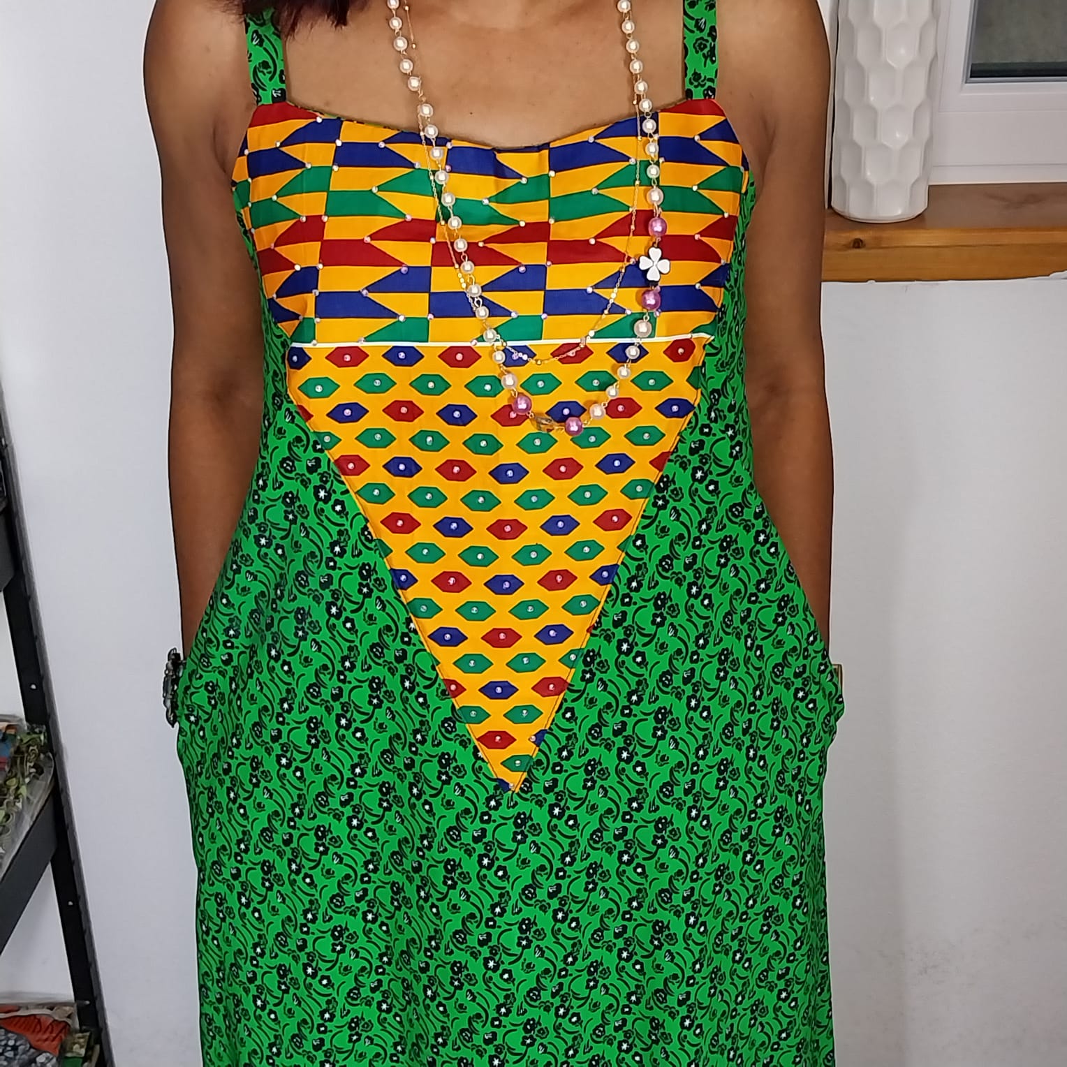 Ankara print fabric with a multicolored piece of Fabric in front , made of 100% Cotton, it.s a straight Bubu dress with two side pockets with swarovski stones for embellishment it s perfect for all occasions . Fabric does not Fade.