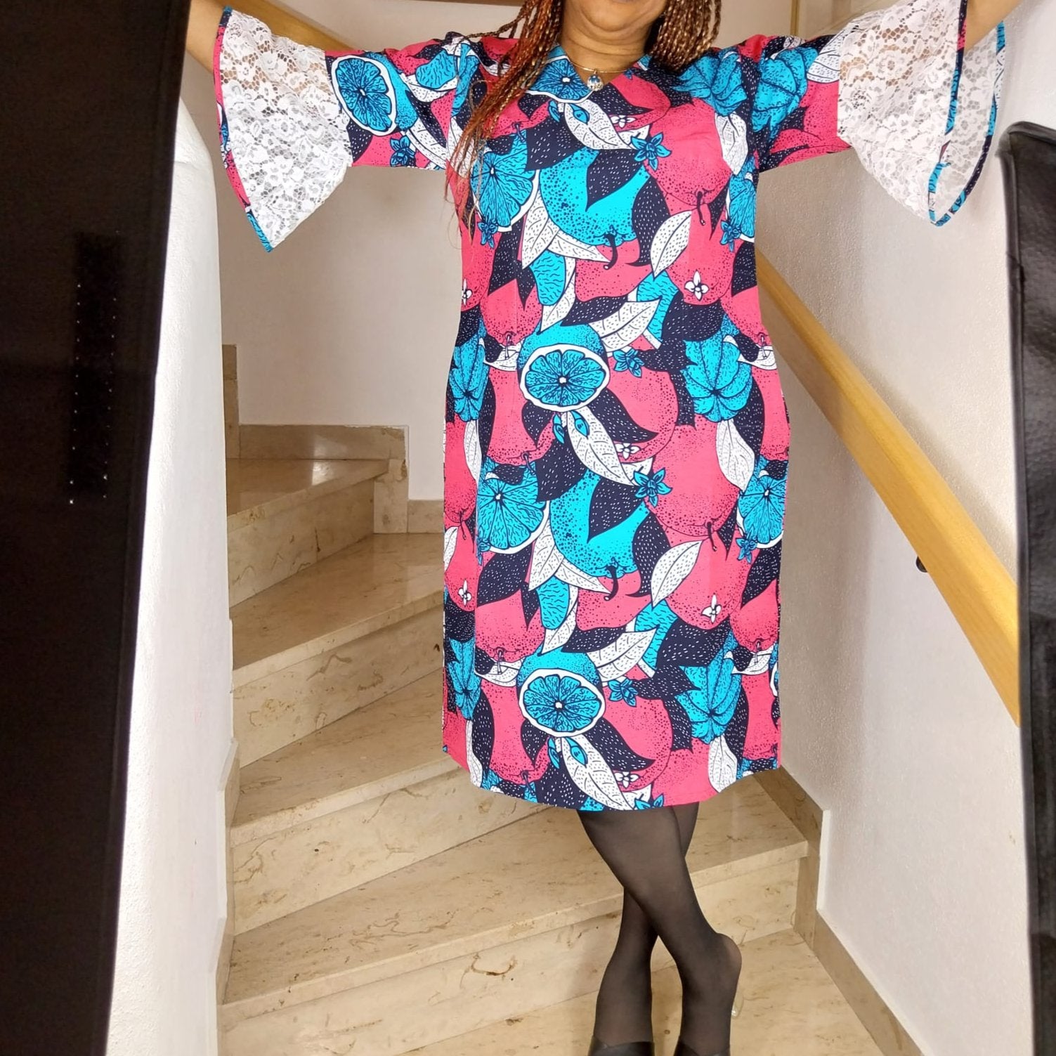 Ankara print midi dress. below-the-knee dress. Cotton dress with lace sleeve design. Dress for women. Short dress.