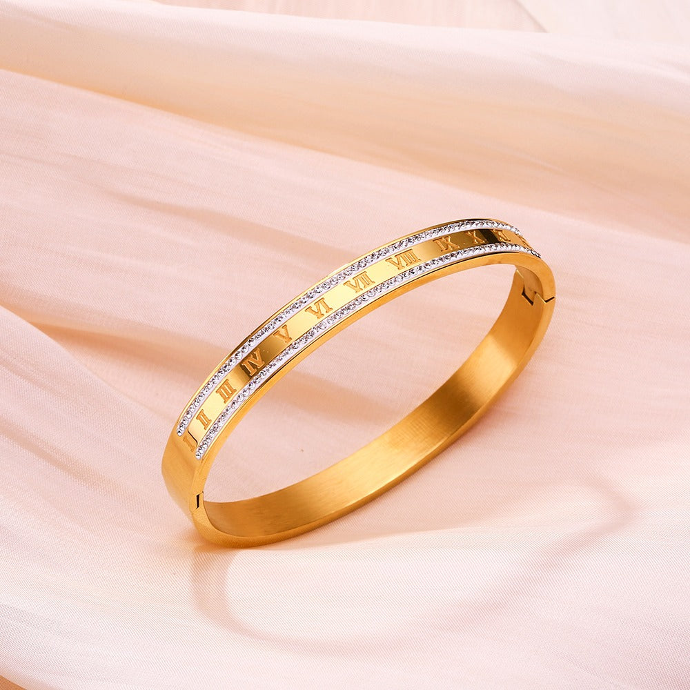 This beautiful bangle accentuates your wrist and outfit. Very simple and elegant when worn on your wrist. it is also comfortable and lightweight. very easy to put on. This bangle is made of stainless steel, it is durable and water resistant, and you can bathe and swim with it. No fading or tarnish. It is hypoallergenic.