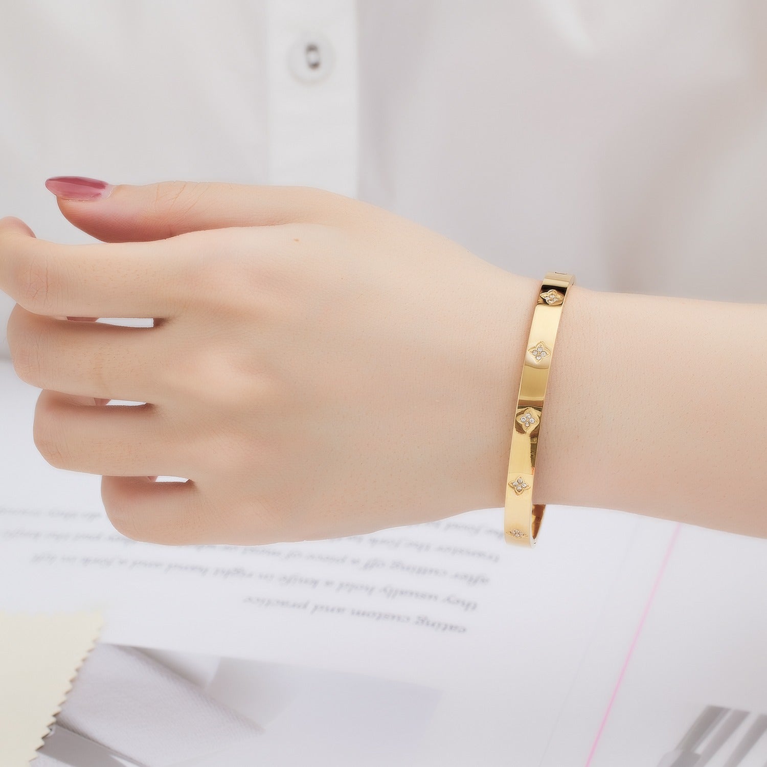 This beautiful bangle accentuates your wrist and outfit. Very simple and elegant when worn on your wrist. it is also comfortable and lightweight. very easy to put on. This bangle is made of stainless steel, it is durable and water resistant, and you can bathe and swim with it. No fading or tarnish. It is hypoallergenic.