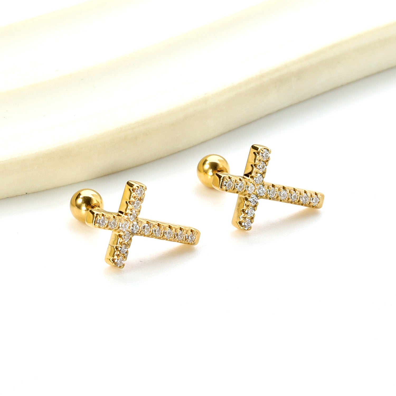 This cross shaped screw studs with zircon stones are super gorgeous. The simple, elegant design makes it stand out.
