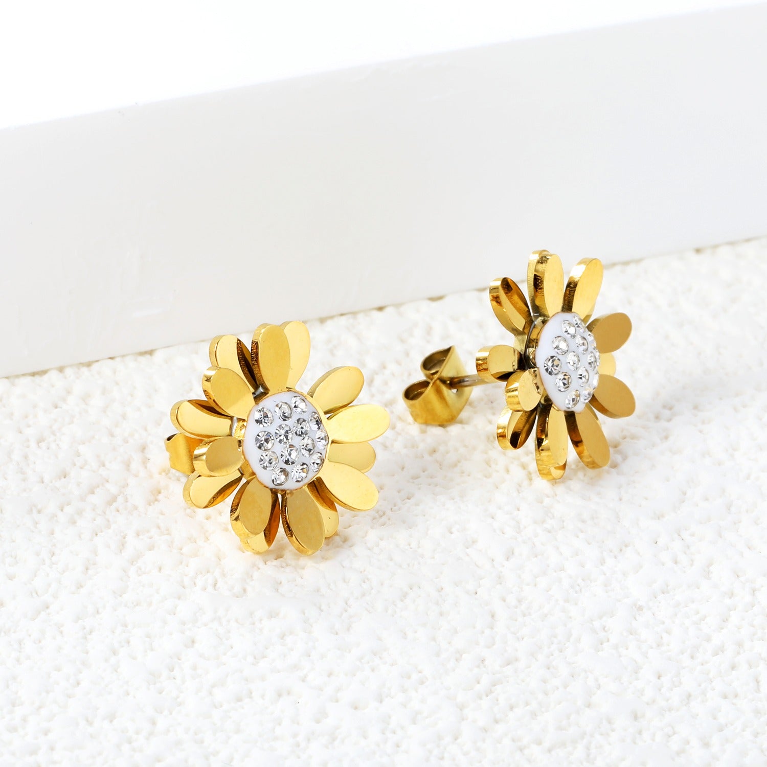 This beautiful Flower studs with stones is chic, it has white color stones on them, and it is available in Gold. The simple, elegant design makes it stand out.