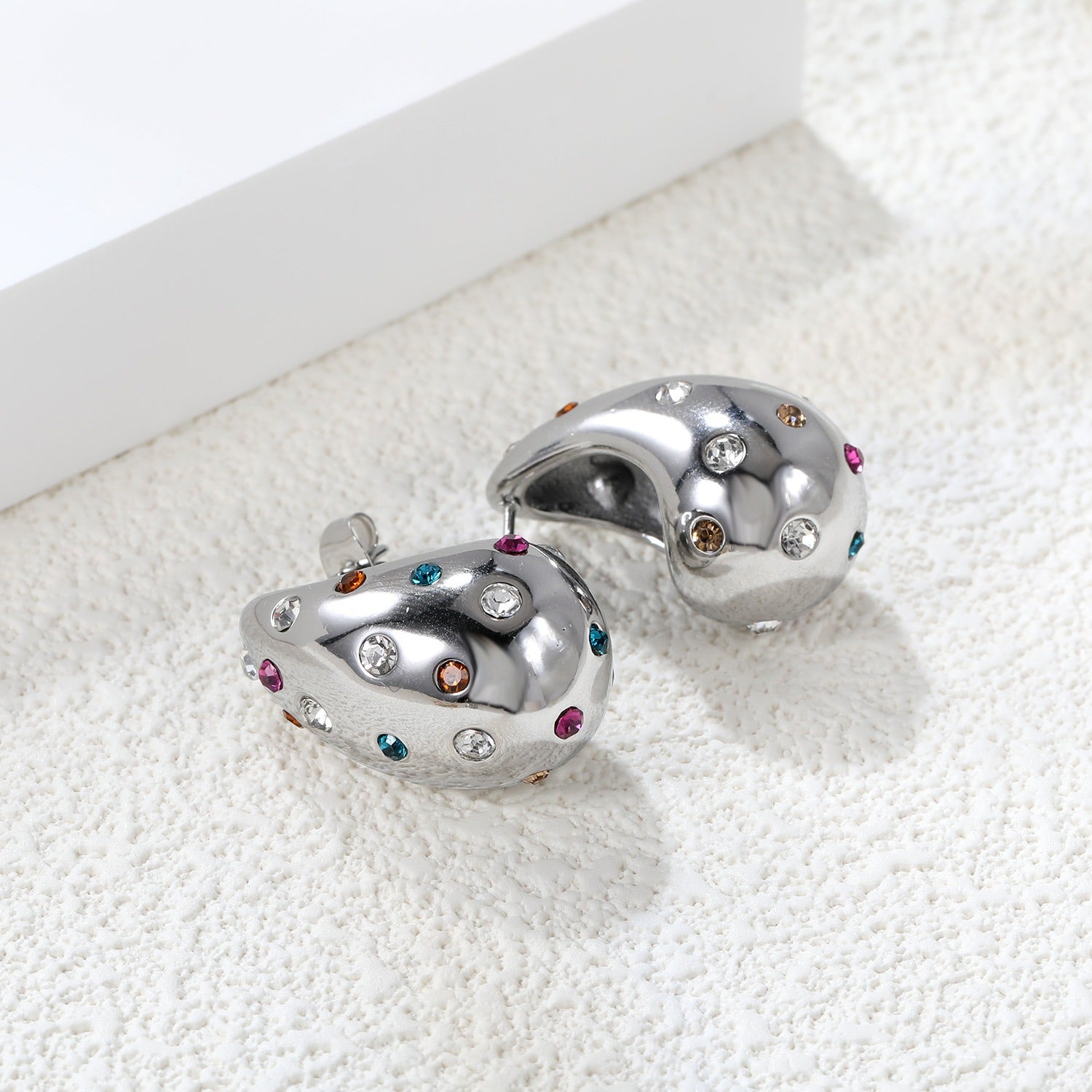 This beautiful tear drop earring is chic, it has diferent color stones on them, and it is available in Silver and Gold. The simple, elegant design makes it stand out.